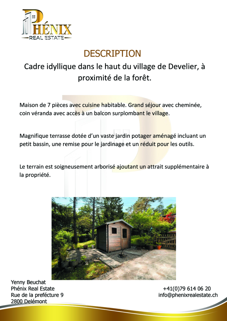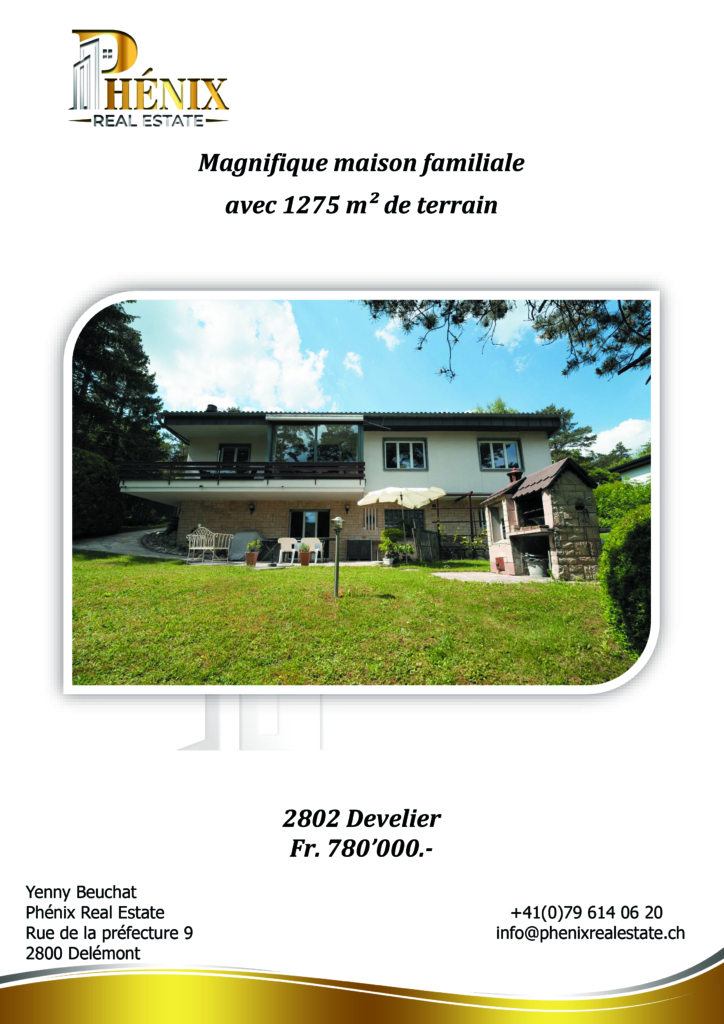 • Caractéristiques principales : Cette belle maison familiale, construite sur une vaste parcelle de 1275 m², offre un cadre de vie idéal pour une famille à la recherche de tranquillité et d’espace. Localisation : 2802 Develier Prix de vente : CHF 780'000.- Grande parcelle verdoyante de 1275 m² Maison lumineuse avec de beaux volumes Espaces extérieurs agréables avec terrasse et jardin Quartier résidentiel calme et verdoyant Cette propriété allie confort, espace et qualité de vie. Idéale pour une famille souhaitant s’installer dans un environnement paisible tout en restant proche des commodités et des axes de communication.